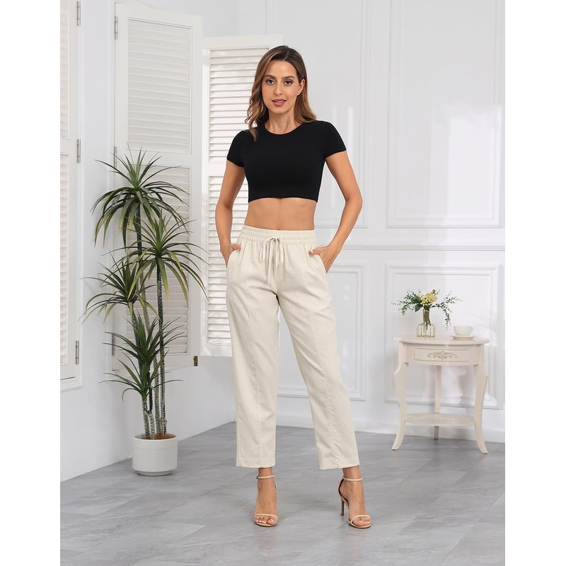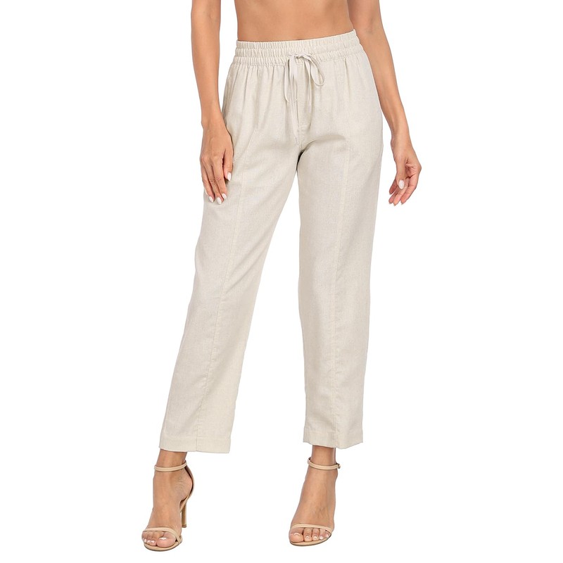 HDE Women's Linen Blend Pull On Pants Summer Drawstring Ankle Pant with Pockets Khaki Sand - L
