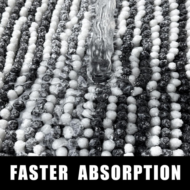 - ODORLESS ABSORBENT PERFORMANCE. Chenille bathroom rug, paired with a non-slip hot melt base, drinks water 3x faster than cotton. Unlike PVC mats, it stays absorbent through multiple showers without trapping chemical fumes