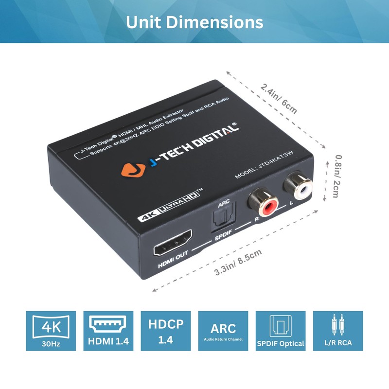 HDMI Audio Extractor 4K 30Hz 1080P 60Hz SPDIF + RCA Output, HDMI ARC Audio Extractor Converter, Dolby Digital/DTS CEC by J-Tech Digital
