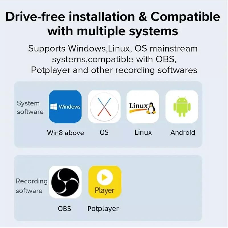 - Universal Capture Device: Herfair hdmi video capture card supports Windows, Android, Linux, iOS and MacOS system, let you go live on any platform in no time. Widely used for game streaming, teaching recording, office meetings, live streaming and so on. Compatible with PS4 Pro, XBox One, Switch, Wii U, Camera, Camcorder, Cell Phone, Laptop, PC, etc.
