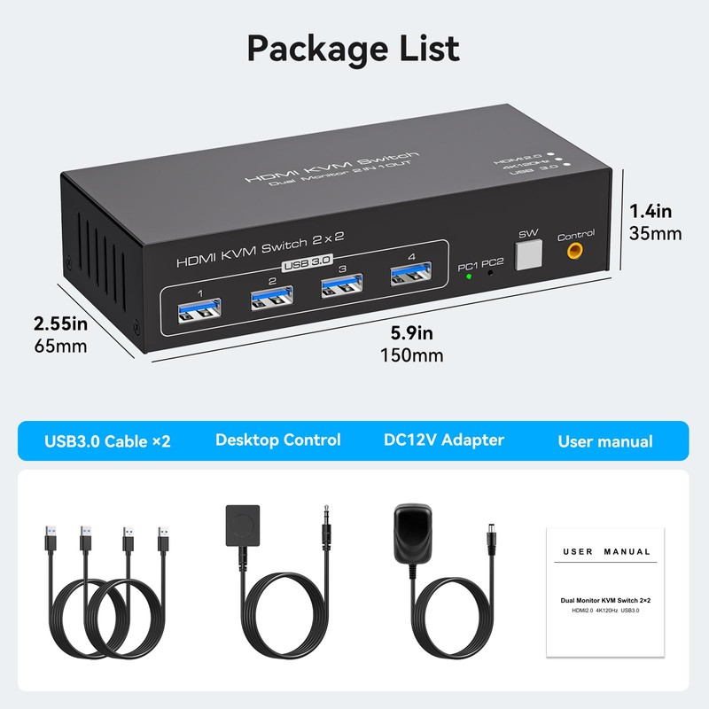 HDMI KVM Switch 2 Monitors 2 Computers 4K@120Hz USB 3.0 KVM Switch Share Dual Monitor and 4 USB Devices Support Extended/Copy Mode