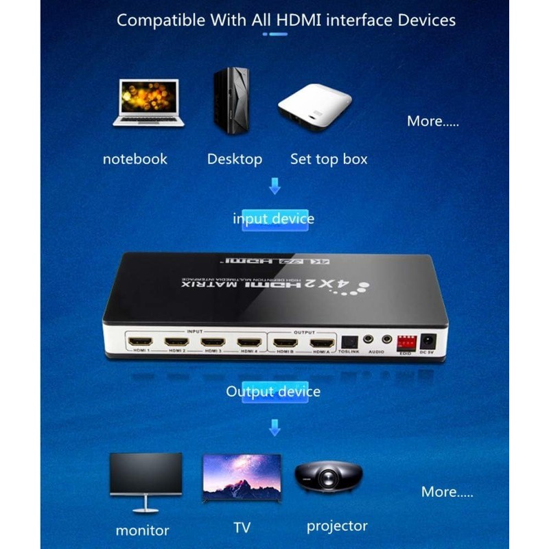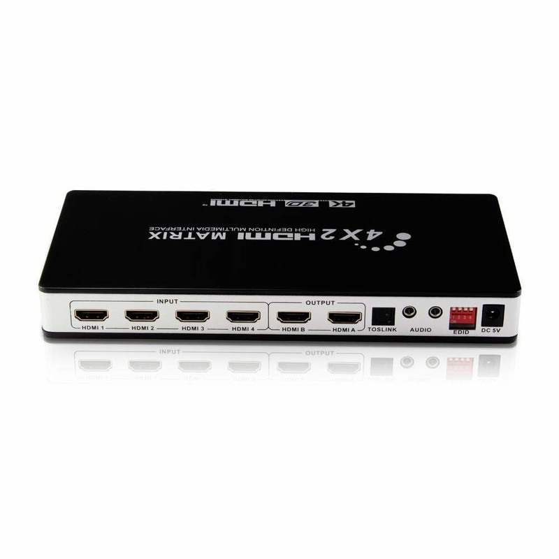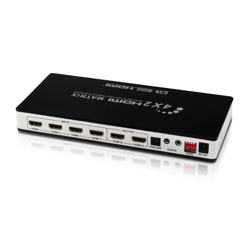 • This 4x2 HDMI matrix switch makes your device more comfortable, productive and cost-effective. Four HDMI sources and two types of audio outputs can be connected simultaneously, optical (Toslink) or analog stereo.