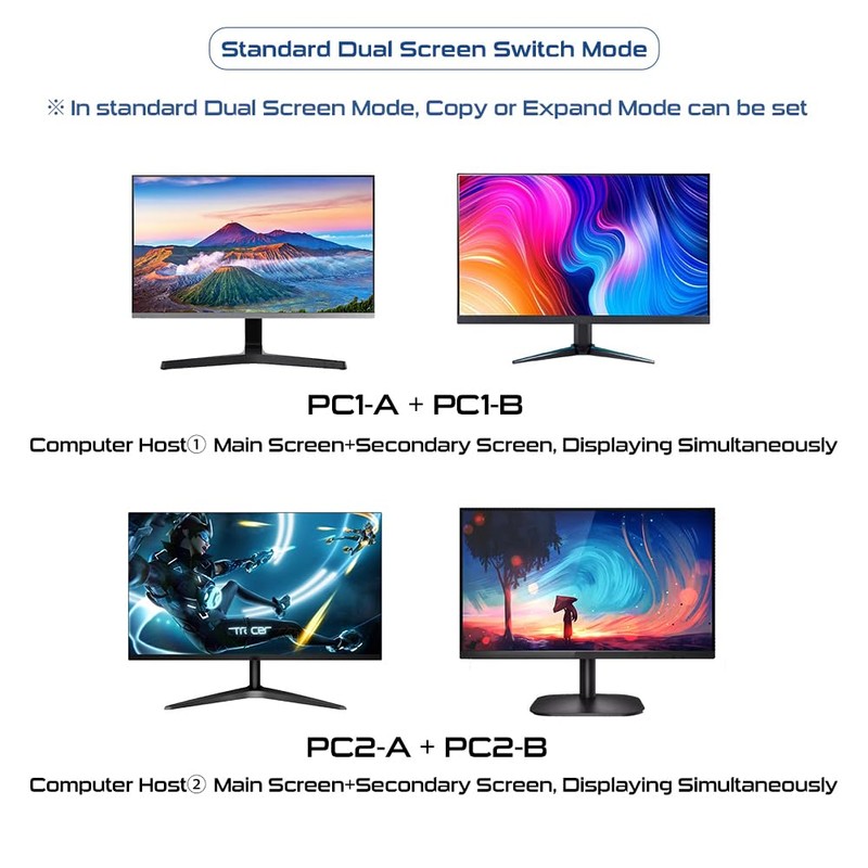 2 PC or Laptop, hot key switching can be achieved through 1 set of keyboard and mouse, and Expansion/Mirror copy/Cross display can be achieved on 2 monitors.