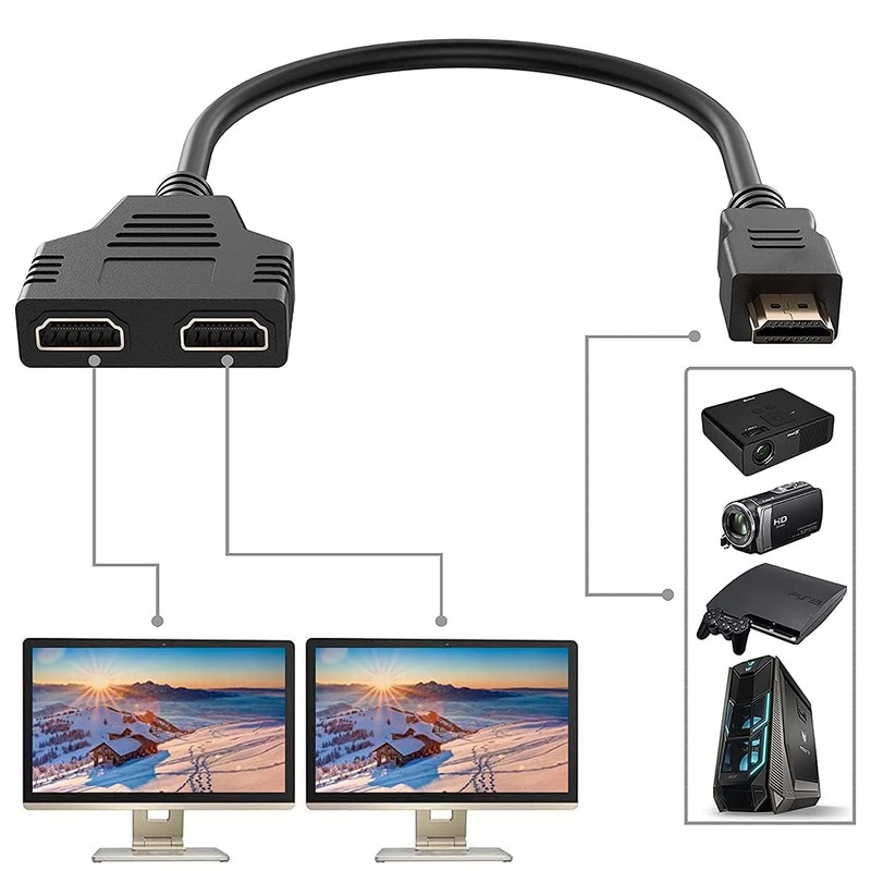 - 👍【Wide Compatibility】HDMI splitter 2 in 1 out cable is ideal for connecting one HDMI compatible device (HD – DVD, PS3, Notebook, HDTV ) to two visual output devises(TV, Projector, Monitor, LCD TVs, Plasma Display, Rear Projection Micro displays, Digital Television ).