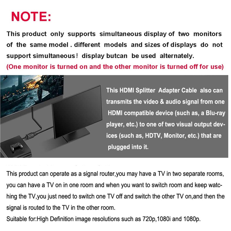 - 👍【Warm Tips】This hdmi splitter 1 in 2 out product is mainly used to extend the original interface of high-end equipment, reducing the number of insertions and removals and reducing damage to the joint.This product only supports simultaneous display of two monitors of the same model . different models and sizes of displays do not support simultaneous !display butcan be used alternately (One monitor is turned on and the other monitor is turned off for use )