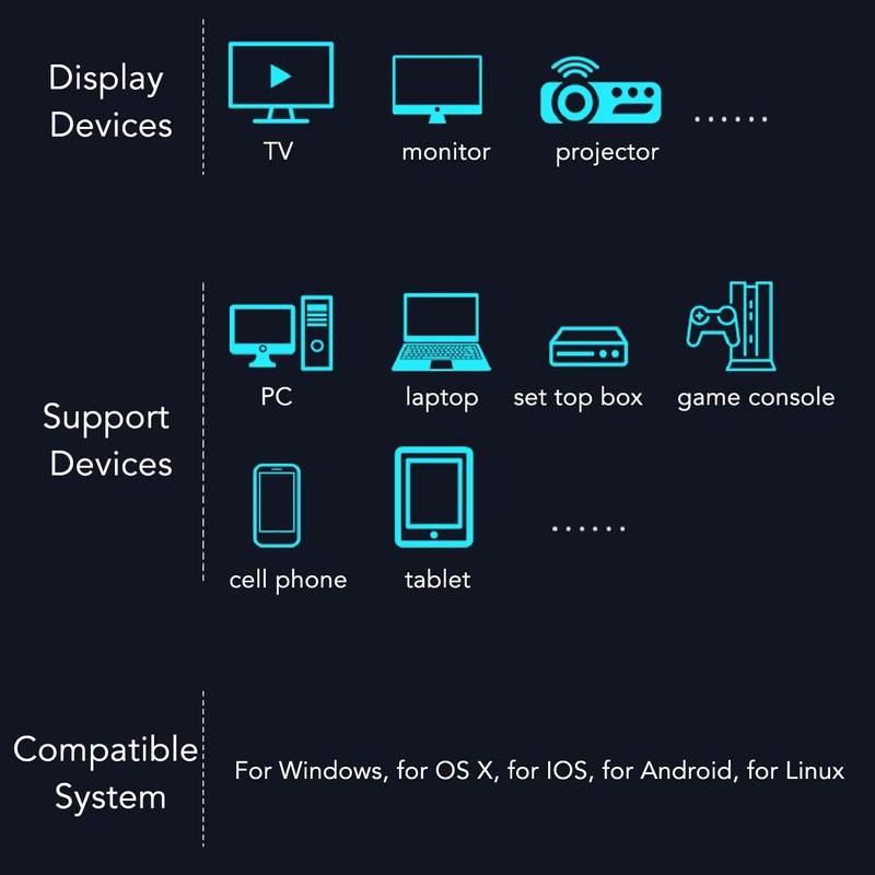 - [Dual Mode] Support dual mode of screen cast and same screen. The screen is synchronized to the big screen in real time, displaying the same screen. Or extend the second screen, can extend the current computer desktop, computer and TV screen is not the same as each other.