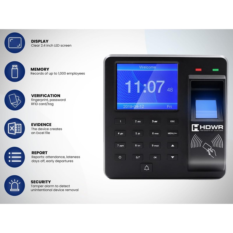 - 【EXTENSIVE INTERNAL STORAGE】: The CTR10 time tracker has the capacity to store data for up to 1000 employees and can register up to 100,000 login events, making it an ideal solution for small and large businesses.