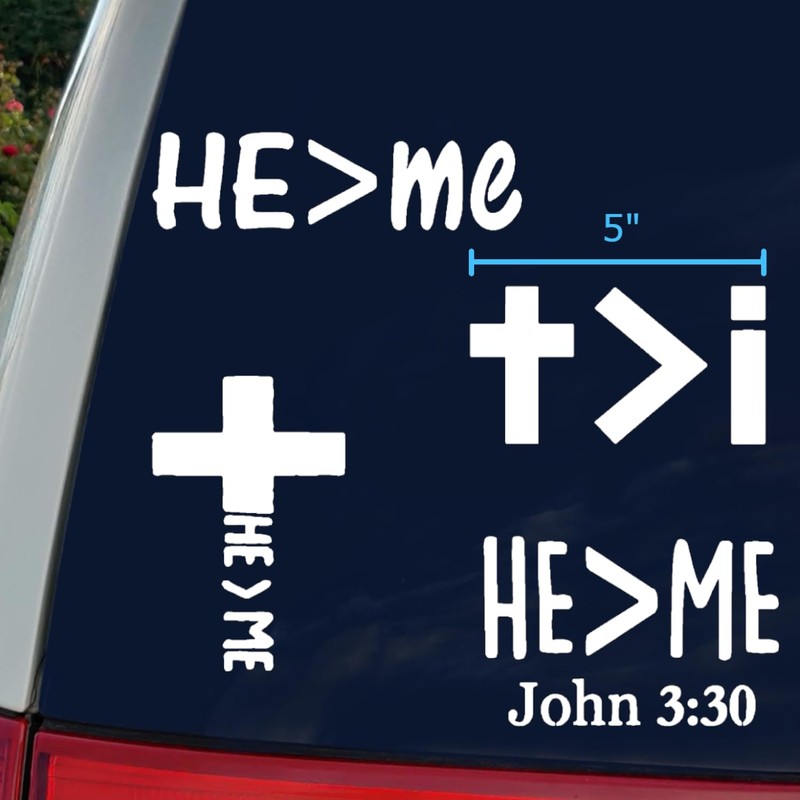 He is Greater Than Me Decal 4 Pack: Text, Cross, Scripture, Greater Than Decals (Large ~5", White)