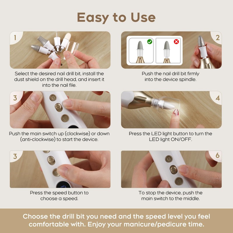 - No Cross Infection: Personal cuticle trimmer. Avoid cleaning the device with water; wipe it with alcohol. The nail drill bits can be cleaned by hard brush. After washing, dry them thoroughly to prevent rust. The drill bits can also be wiped with alcohol