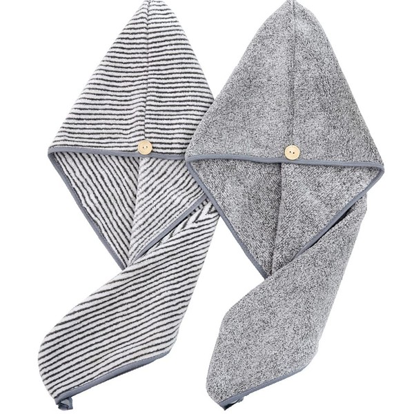 Heacoz Super Absorbent Microfibre Hair Towel wrap for Women - Quick Dry, Soft Hair Drying Cap (2 Pack, Grey & Stripe)