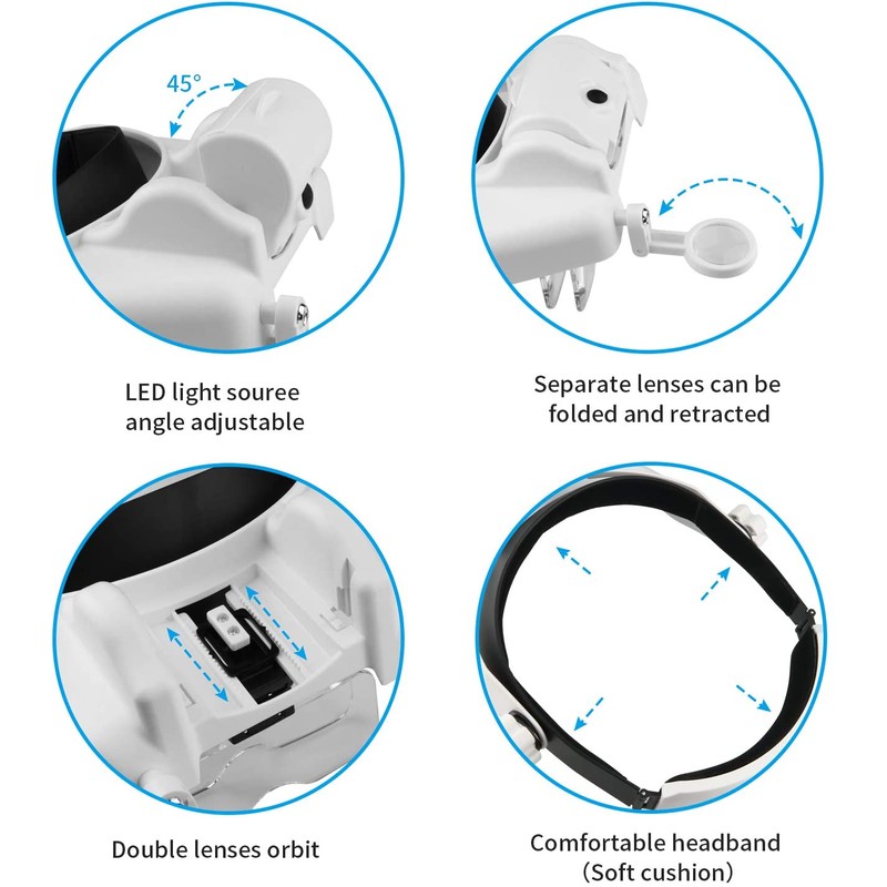 - 【Comfortable to Wear】- Soft padded headband with two rotary knobs on the left and right, rotate anticlockwise to release the whole lighting frame from the headband so that you can freely regulate the total lighting frame upwards or downwards to the angle that is needed. Tail knob used to adjust headband size for fit over different head, pull it outwards and rotate left or right to get your head size, then press it to lock.