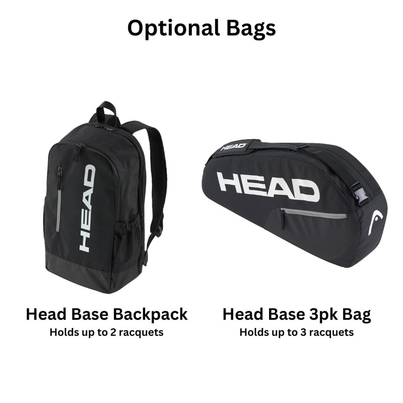 - ADD A TENNIS BAG: Stay organized and head to the court in style by adding a HEAD Base Backpack or 3pk Bag to your tennis set. Both bags are Black/White in color and made of 100% Polyester. The Base Backpack has enough room for two racquets and features two side pockets for water bottles. It measures 21 x 5 x 13 in. The Base 3pk Bag has one main compartment with space for up to 3 racquets and measures 30 x 4 x 13 in.