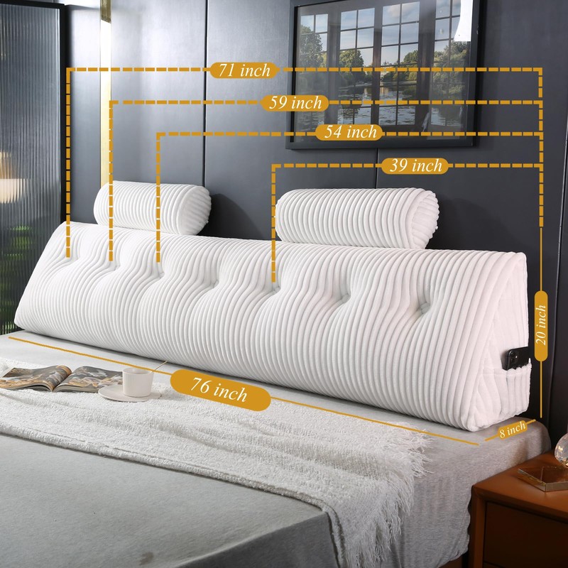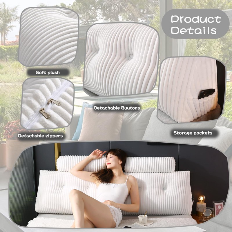 - Large Headboard Wedge Pillow with Two Neck Roll Pillows. This set includes two detachable round pillows, perfect for additional back or head support, allowing you to place them wherever you need for optimal comfort. The wedge pillow also features two side pockets, providing convenient storage for your phone, glasses, or other small items, making it easy to locate your essentials in the middle of the night.