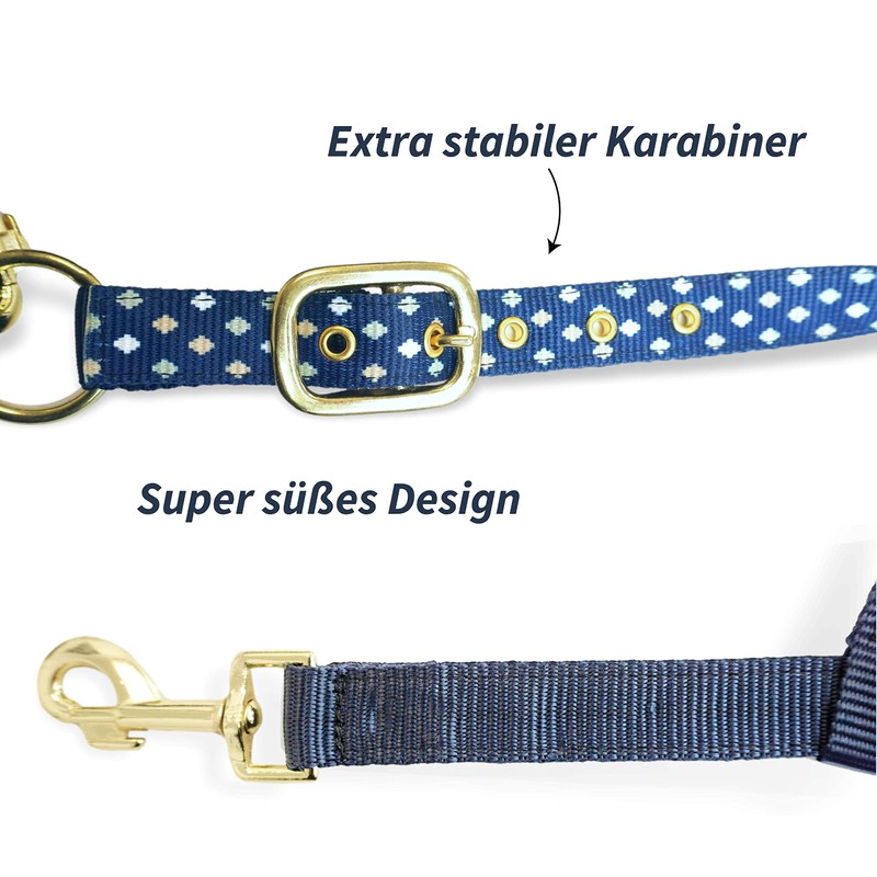 - 2-way adjustable: a perfect fit of the halter dark blue is made possible thanks to the adjustment on the chin strap and headpiece. A sturdy hook and chrome-plated fittings ensure quality and long durability.