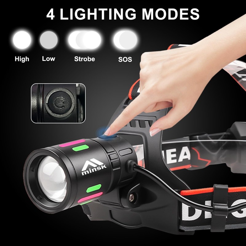 - Super High Brightness & 4 Lighting Modes: The rechargeable headlamp uses advanced LED beads to provide high illumination, including 4 working modes: strong light, low light, fast flash, long press SOS, and staying in any gear for 10 seconds and pressing again is to switch off.The LED head lamp can be used in a variety of lighting scenarios, such as camping, hiking, emergency and so on.