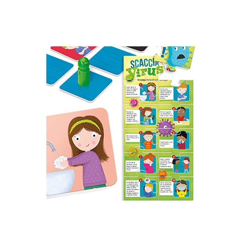 • CONTENT: 20 behavior cards; 5 virus cards; 1 spinner; 4 pedestrians; 8 mask cards; 24 sanitizing tokens; 1 puzzle of good practices; Regulation