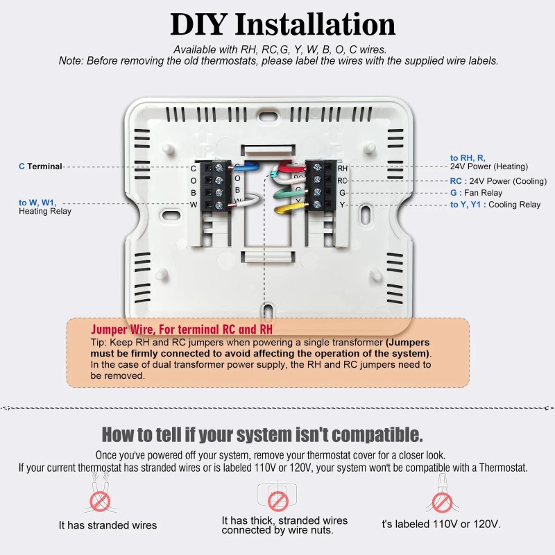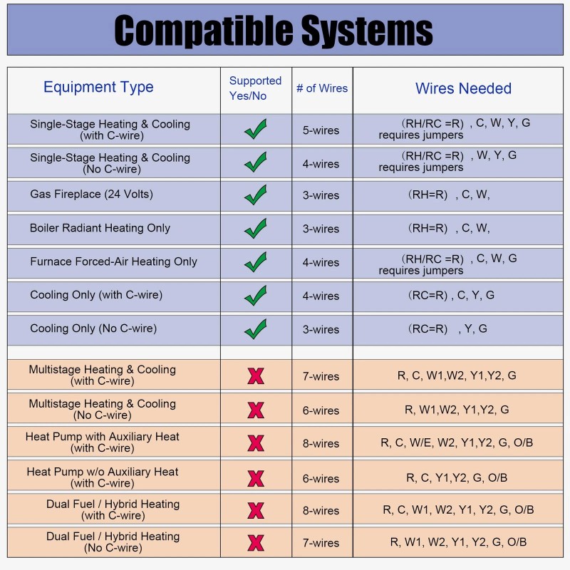 【Incompatible Systems】Does not work multistage systems (1H/2C, 2H/2C, 3H/2C), HVAC heat pump systems (2H/1C, 2H/2C, 4H/2C), PTACs, 3-wire hydronic (hot water), dual fuel/hybrid heating. Does not work line voltage systems (120-240V electric baseboards heat); mini split heat pump air conditioner, RV air conditioners mach and roughneck series.