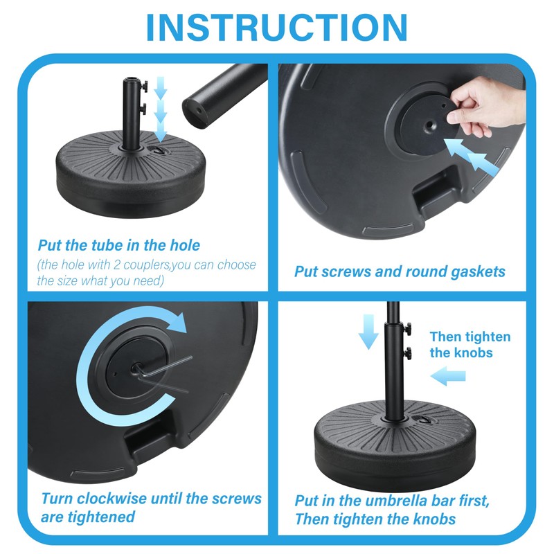 - Wide application: The base holds various umbrella sizes. Plastic insert on top of steel tube is ideal for Φ1.5"(38mm)-Φ1.9"(48mm) umbrella pole. You just need to insert the umbrella pole into the base, and tighten the knobs