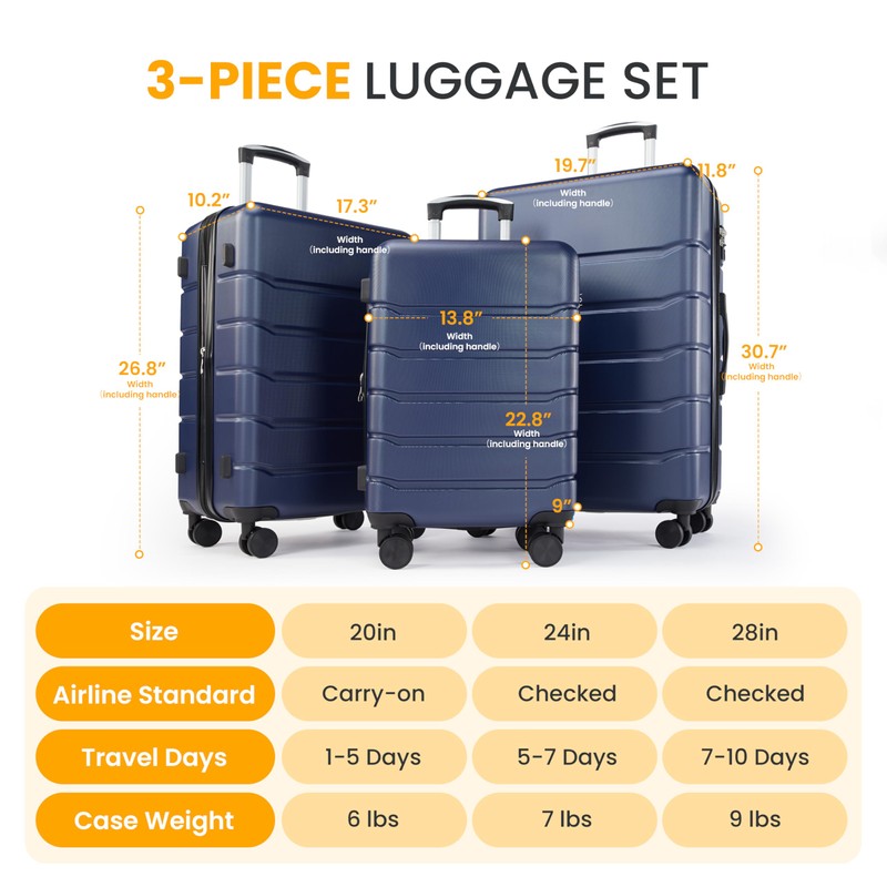 HealSmart Hardside Carry-On Luggage Expandable Portable Hardshell Spinner Wheels, Lightweight Suitcase TSA Lock, Blue, 3-Piece Set (20/24/28)