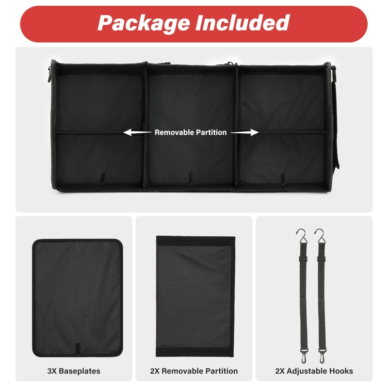 - Smart, Adjustable Design: Stay organized with 3 spacious compartments, 3 base plates, and 2 removable dividers for customizable storage. Features anti-slip padding, elastic straps, and hooks to secure cargo. Collapses flat when empty to save space.