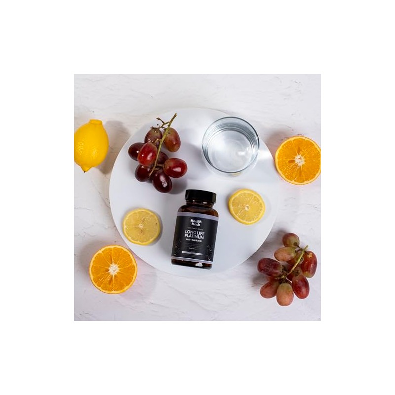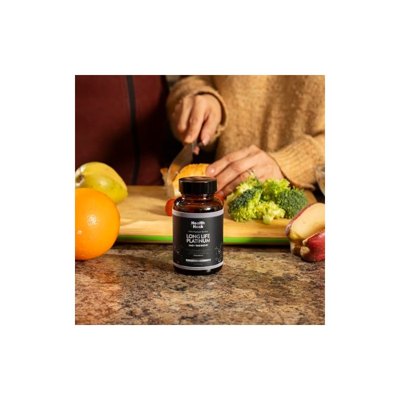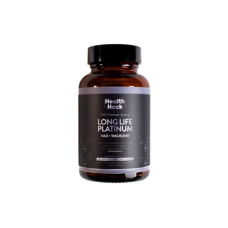 Health Hack LongLife Platinum NAD+ TMG Blend | Soporte Avanzado para Vitalidad y Longevidad | Con Trimetilglicina, NAD, CoQ10, Acetil L-Carnitina, Semilla de Uva, Resveratrol, Vitaminas C, E, y D
