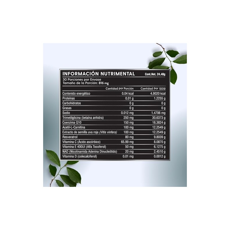- Acerca de este artículo 🔬【POTENCIA DE NAD+ Y TMG】LongLife Platinum incluye NAD+ y TMG, aliados esenciales para la vitalidad celular. El NAD+ es clave en la reparación y el metabolismo celular, apoyando la longevidad y el dinamismo. El TMG favorece la salud cardiovascular y metabólica, mejorando la eficiencia energética. Juntos, estos componentes elevan tu energía celular, promoviendo resistencia y bienestar a largo plazo. Ideal para quienes buscan mantener su vigor y una vida activa y saludable. 🍇【COMPUESTOS NATURALES PARA BIENESTAR ÓPTIMO】Este suplemento incluye ingredientes naturales como Semilla de Uva y Resveratrol, conocidos por sus propiedades beneficiosas. Juntos, estos componentes trabajan para mantener tu bienestar general, permitiéndote abordar tus actividades diarias con mayor vitalidad. 🧪【APOYO CON VITAMINAS ESENCIALES】LongLife Platinum está enriquecido con Vitaminas C y E, junto con NAD, que contribuyen a mantener el equilibrio nutricional óptimo. Estos ingredientes clave son fundamentales para mantener tu energía y resistencia a lo largo del día. 🌟【SOPORTE INTEGRAL PARA VITALIDAD】LongLife Platinum de Health Hack es una fórmula premium diseñada para apoyar tu vitalidad y energía. Con Trimetilglicina, CoQ10 y Acetil L