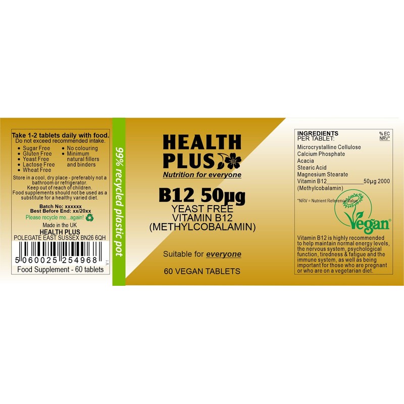 Health Plus B12 50µg : Yeast Free Vitamin B12 Supplement : 60 Tablets, in a Planet-Friendly 99% Recycled Pot