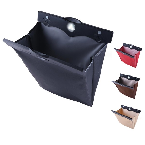 - This stylish car trash can is perfect for anyone who wants to keep their car clean. This dust box is made of high quality PU leather for a durable yet sophisticated look. LED lights make it easy to see the contents at night and handle the garbage in comfort. And with double mounting options of magnets and hooks, you can easily install it anywhere in your car. The space saving design ensures the capacity you need, and it folds up for compact storage when not in use. It is also water resistant so you can rest assured that your drink will be spilled. The size fits into the back seat pocket and helps keep your car organized. This trash can is a car accessory that combines functionality and design while maintaining the comfort of your vehicle. It is a must have for keeping your drive more fun and clean