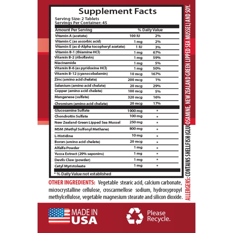 • Active Ingredients: Boron, Chondroitin Sulfate, Glucosamine Sulfate, L-Histidine, New Zealand Green Lipped Sea Mussel, MSM (methylsulfonylmethane), Alfalfa Herb Powder, Devil's Claw Root Powder, Cetyl Myristoleate