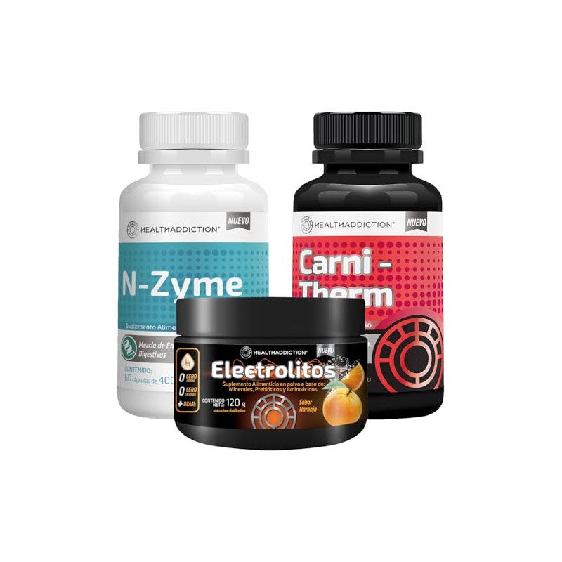 🌟 ⭐ HEALTHADDICTION – Electrolitos con BCAA’s + Enzimas Digestivas + Carnitherm con L-Carnitina, Té Verde y Cromo – Quema & Control Pack – Fórmulas Sin Azúcar y Sin Gluten – 3 Suplementos ⭐ 🌟