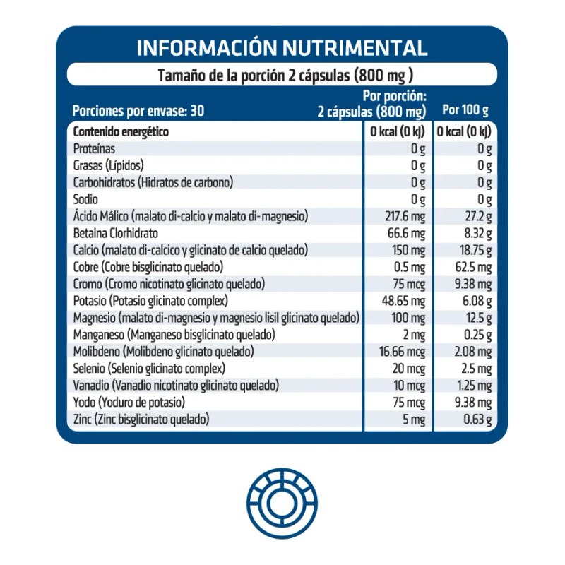 Ingredientes Activos: Una fórmula rica en minerales quelados como Magnesio, Calcio, Potasio, Ácido Málico, Selenio, Zinc, Cobre, Cromo, Manganeso, Molibdeno, Vanadio y Yodo para garantizar la máxima eficacia y absorción.