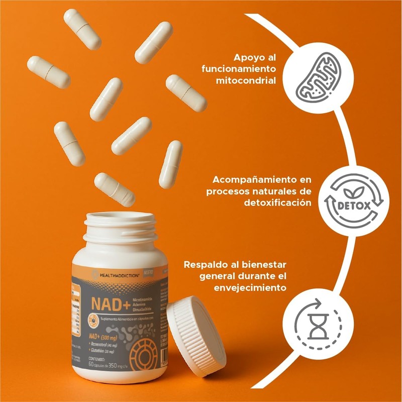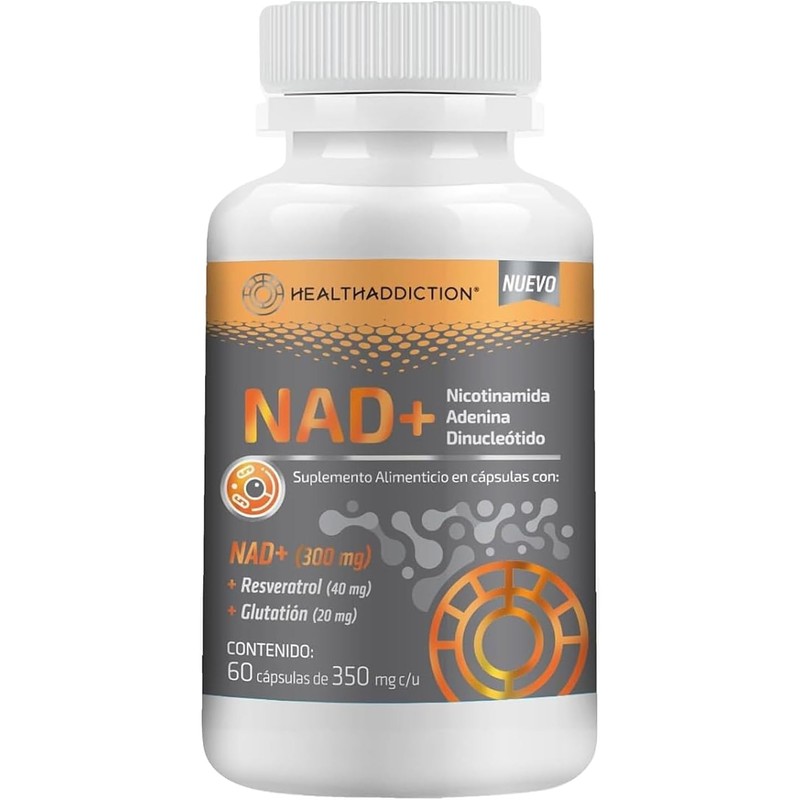 NAD+ de Healthaddiction es un suplemento alimenticio en cápsulas formulado con 300 mg de NAD+ (Nicotinamida Adenina Dinucleótido), 40 mg de Resveratrol y 20 mg de Glutatión por porción. Su presentación práctica facilita su incorporación a una rutina diaria. Este producto está libre de gluten, sin azúcar añadida, ni saborizantes ni colorantes artificiales. Su fórmula está diseñada para quienes buscan complementar su alimentación de forma práctica y funcional. Elaborado con ingredientes de calidad y procesos que siguen buenas prácticas de manufactura. No contiene propiedades terapéuticas ni sustituye una alimentación balanceada.