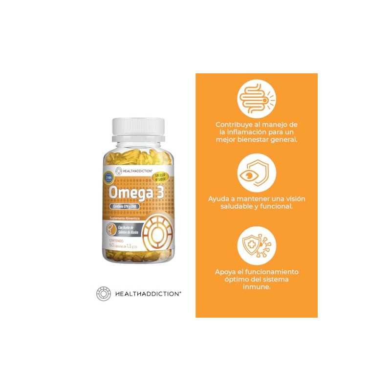 HEALTHADDICTION - Omega 3 Premium sin Sabor a Pescado, 60 Cpsulas de 1.2g cu, Con Alto Contenido de EPA y DHA - Aceite de Pescado de Calidad