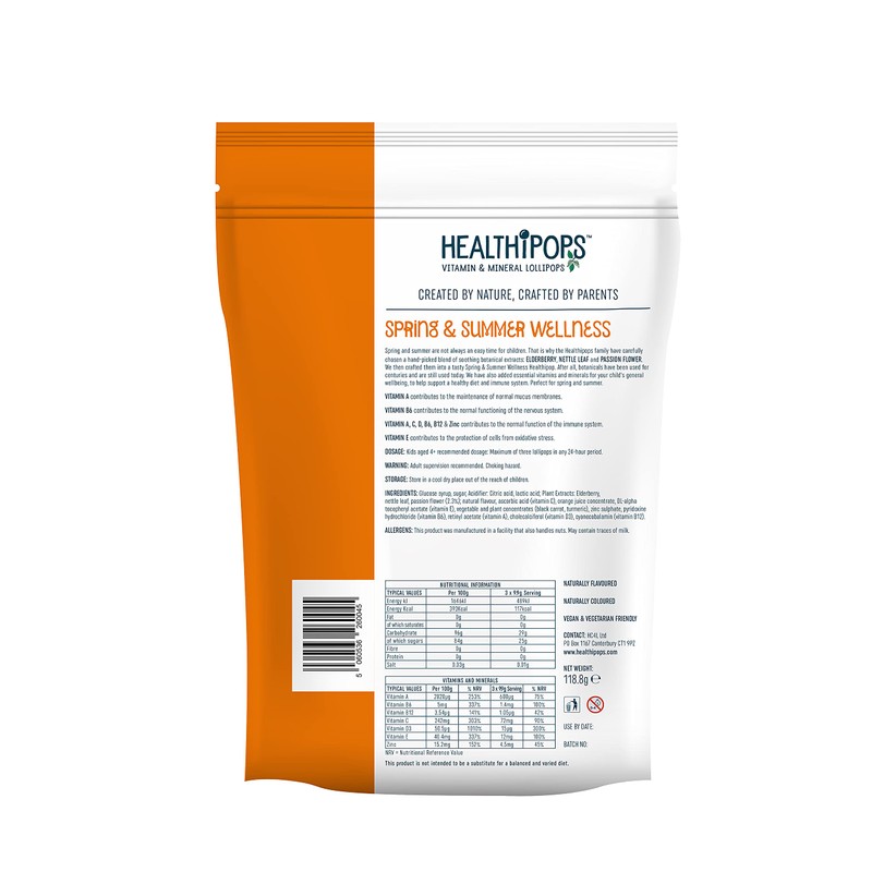 Healthipops Vitamin & Mineral Lollipops Spring and Summer Wellness Suitable for Ages 4+ with Added Soothing Botanicals, Elderberry, Nettle Leaf and Passion Flower, Orange Flavour 12 Lollipops