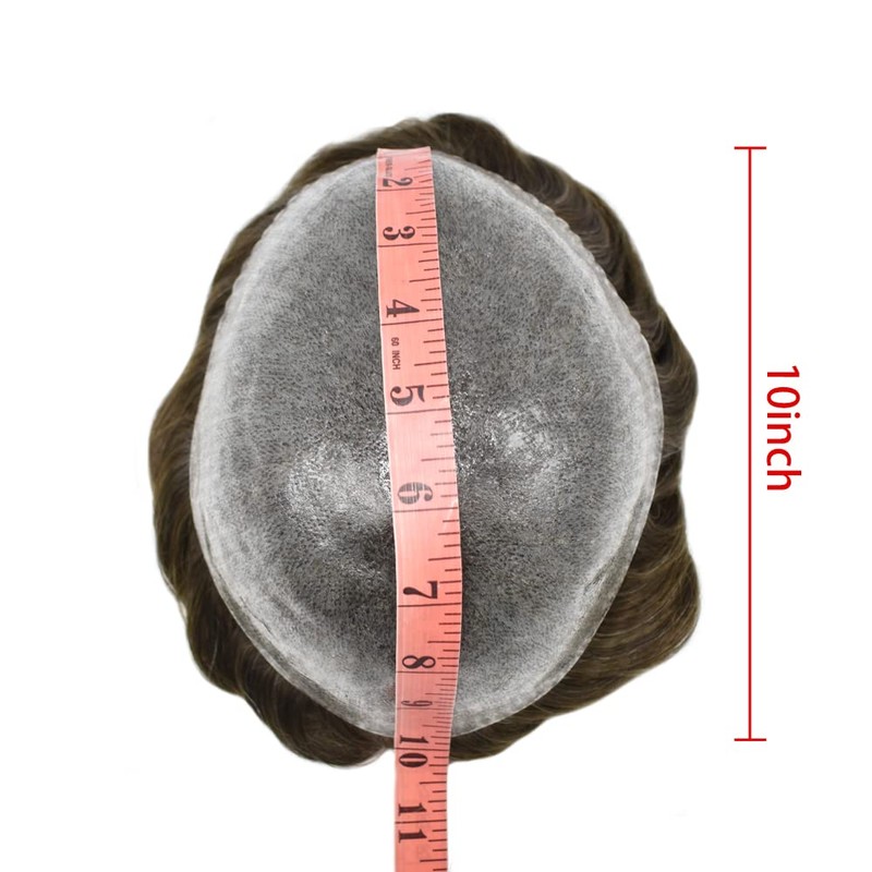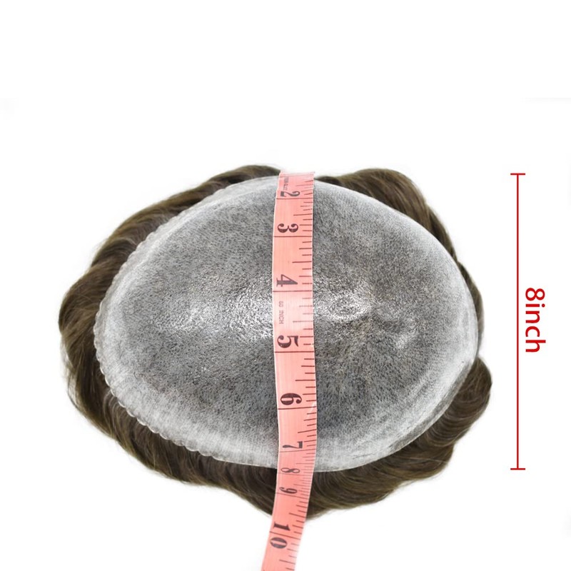 - Mens hair piece 7"X9",8"X10"=Width (side to side)X Length (front to back), Lightweight soft and comfortable to wear, the skin base is easy to tape and clean, apply glue to the scalp, activate glue and press hair system into place, thin skin base looks more natural, no one could realize that you are wearing a toupee.