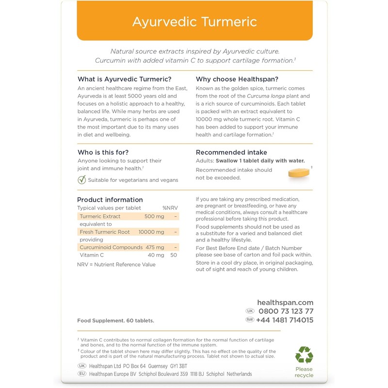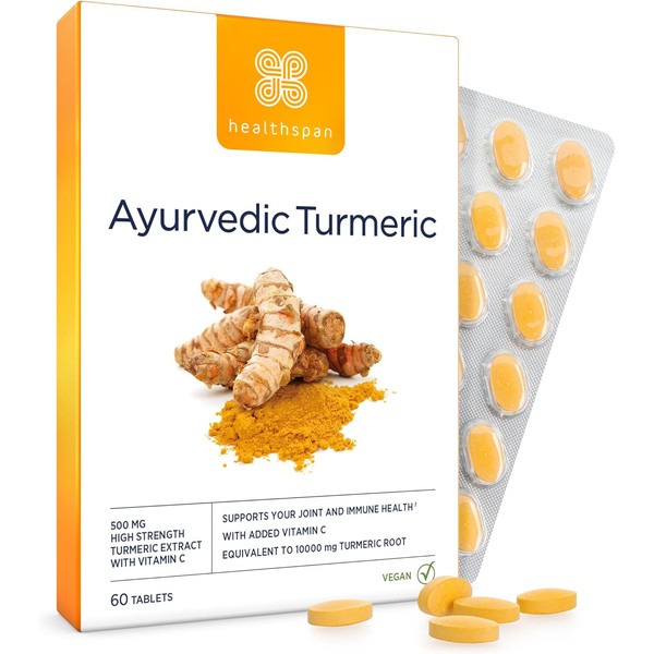 Healthspan Ayurvedic Turmeric – 60 Tablets | High Strength with 95% Curcuminoids | With Added Vitamin C for Joint, Immune & Antioxidant Support | Vegan Friendly | Traditional Ayurvedic Formula