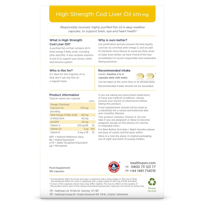 Healthspan's cod liver oil is sustainably sourced from the pristine waters of Lofoten in Northern Norway, and we can proudly say that our High Strength Cod Liver Oil 570 mg contains oil that has been granted 'Friend of the Sea' certification. Friend of the Sea are known for their thorough certification procedure, using stringent guidelines before awarding their seal of approval. Healthspan's oil is refined to ensure it's extremely pure and virtually taste and odour−free. They also include our unique St Clements citrus flavouring to make our cod liver oil capsules even tastier. Finally, they created small capsules so are easy for you to swallow. The UK's Food Standards Agency advises that we eat a minimum of two portions of oily fish per week − equal to 450 mg per day of the long−chain omega 3 fatty acids. Not a lot of people manage to get this into their regular diet, which is why Healthspan recommend two to four of our High Strength Cod Liver Oil 570 mg capsules daily. Two capsules provide 26 % total omega 3 fatty acids, including 120 mg DHA and 140 mg EPA. If you are looking for higher levels of DHA and EPA per capsule, try our Super Strength Cod Liver Oil 1200 mg.