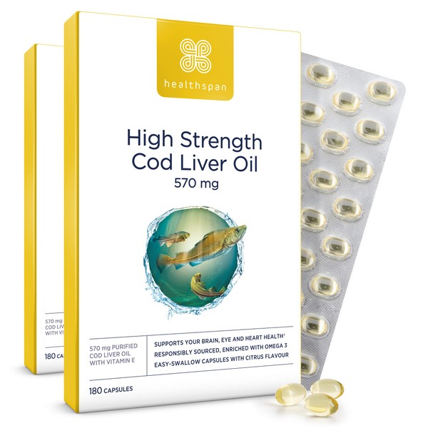 Healthspan Cod Liver Oil 570mg | Support Your Brain, Heart, Eyes & Bones | 150mg Omega 3 Fatty acids per Capsule (360 Capsules)