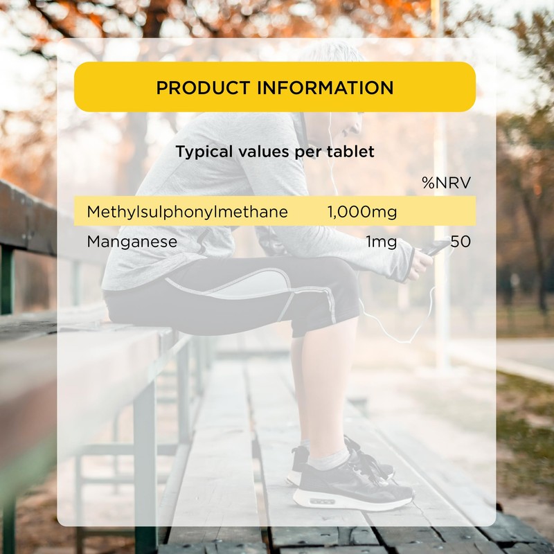 Product descriptionWhat is MSM?MSM (methylsulphonylmethane) is a naturally occurring organic sulphur compound that acts as a major building block of complex proteins called glycosaminoglycans, key structural components of joint cartilage. MSM is made up of 34 % sulfur ? the fourth most abundant mineral in the human body. Sulfur is an important nutrient for the maintenance of joints, tendons, ligaments and other connective tissues. MSM occurs in small amounts in certain foods, however nutritionists believe that diets are generally low in sulphur and therefore often recommend an MSM supplement.Why choose Healthspan's MSM tablets?Healthspan's high strength formulation contains 1000 mg MSM (methylsulphonylmethane) per tablet. They've also added manganese, an important mineral that contributes to the normal formation of connective tissue. Research suggests that an intake of 2-3 g of MSM daily is required to achieve optimum results C Healthspan MSM tablets provide a convenient way to achieve these recommended levels.IngredientsMethylsulphonylmethane, Bulking Agent: Microcrystalline Cellulose, Coating (Hypromellose, Talc), Anti-Caking Agent: Silicon Dioxide, Magnesium Stearate, Stearic Acid, Manganese Sulphate.DirectionsSwallow one tablet two or three times daily with water. For optimal results, best taken at meal times. Recommended intake should not be exceeded.Safety WarningIf you are taking any prescribed medication or have any medical conditions always consult your doctor or pharmacist before taking vitamins or supplements. Food supplements should not be used as a substitute for a varied and balanced diet and a healthy lifestyle. Store in a cool dry place, in original packaging, out of sight and reach of young children. If you experience an adverse reaction, stop taking the supplement and seek medical advice.