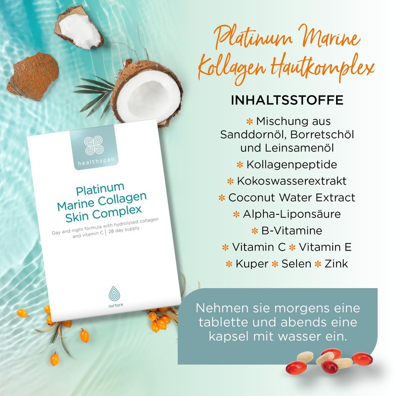 • WAS IST DAS PLATINUM MARINE COLLAGEN SKIN COMPLEX? Ein Premium-Tages- und Nacht-Schönheitspräparat, das marine Kollagenpeptide, Vitamin C und eine Mischung aus Mikronährstoffen enthält, die entwickelt wurde, um die Gesundheit Ihrer Haut von innen zu unterstützen.