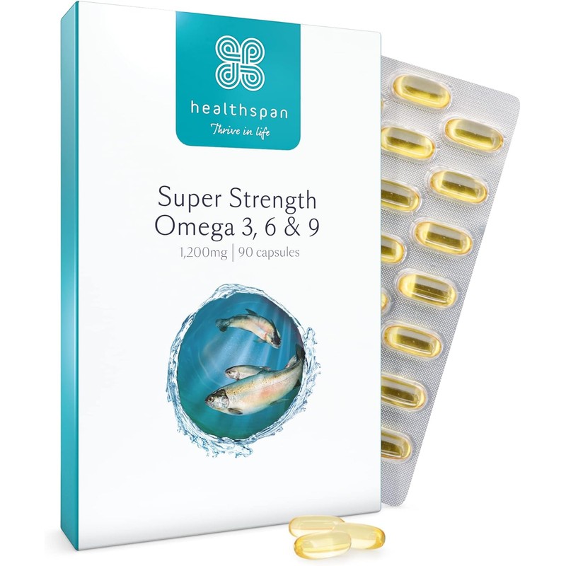 Healthspan Super Strength Omega 3, 6 & 9 1,200mg (90 Capsules) | Brain, Eye & Heart Health | Omega 3, 6 & 9 Fatty Acids | Premium Fish, Borage & Extra-Virgin Olive Oils | Sustainably Sourced