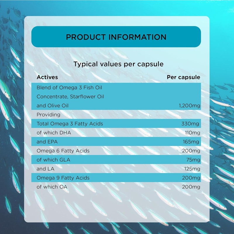 Fish Oil Concentrate (Fish Oil, Mixed Tocopherols), Starflower Oil, Capsule Shell (Gelatin, Glycerin), Olive Oil.