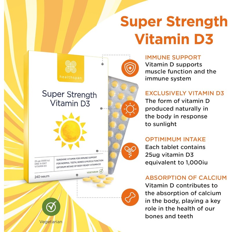 - WHY CHOOSE HEALTHSPAN’S VITAMIN D3? Healthspan’s Super Strength D3 contains exclusively vitamin D3, which is the form of vitamin D produced naturally in the body in response to sunlight. Research shows that optimum intake levels of vitamin D are now far higher than originally thought, so Healthspan have included 25µg (1,000iu) of natural source vitamin D3 into each daily tablet.