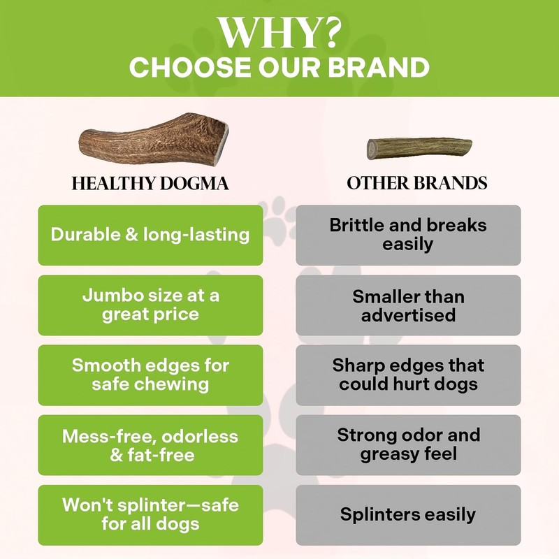 - 4. Jumbo-Size Premium Elk Antler – Ideal for Tough Chewers: Healthy Dogma elk antler for dogs withstands aggressive chewing, offering long-lasting durability. Each antler dog chew measures over 8 inches in length and weighs approximately 12–15 ounces, making it perfect for large dogs and aggressive chewers.