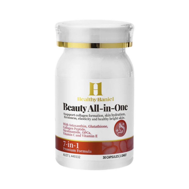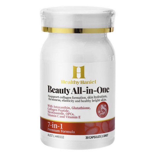 Healthy Haniel Beauty All-in-One features a blend of Astaxanthin, Glutathione, Collagen Peptide, Nicotinamide, OPCs, Vitamin C, and Vitamin E, designed to support skin health. This advanced formula aims to assist in maintaining a brighter complexion, reducing the appearance of fine lines, enhancing skin firmness, providing antioxidant protection, improving hydration, and reducing free radicals formed in the body. Enjoy the benefits of a well-nourished and radiant-looking skin with Healthy Haniel Beauty All-in-One.
