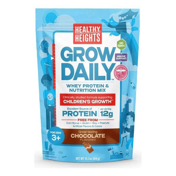 Healthy Height® Grow Daily es una mezcla de licuado de proteínas clínicamente probada para niños de 3+ años. Formulada por pediatras, contiene 12g de proteína de suero, arginina y más de 15 vitaminas y minerales esenciales para el crecimiento, desarrollo óseo y muscular. Ideal para comedores exigentes, es sin OGM, gluten ni soya, y sin aditivos artificiales. Disponible en Chocolate, Vainilla y Natural. ¡Solo 2 cacitos al día para apoyar su potencial de crecimiento!
