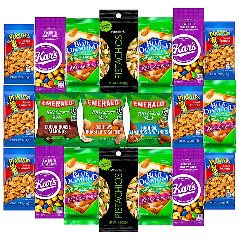 Healthy Snacks Care Package Grab And Go Variety Nuts Pack (20 Count) Include Wonderful Pistachios, Emerald Nuts, Almonds, Planters Peanuts , Blue Diamoond Almonds, Kars Nuts & More