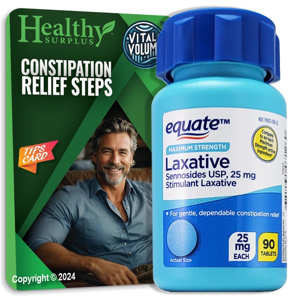 - Equate Maximum Strength Stimulant Laxative, 25 mg Sennosides USP, 90 Tablets and Vital Volumes Constipation Tips Card | Bundle