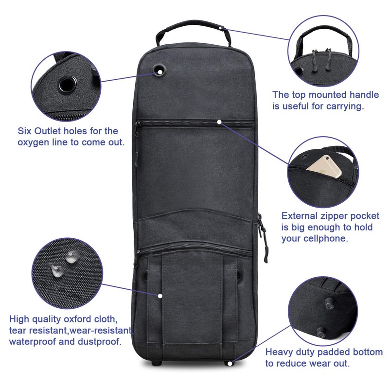 - Made carrying your oxygen tank much easier. This oxygen cylinder backpack provides a balanced, hands free way to carry contents.
