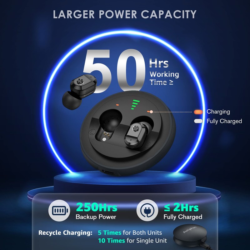 - Rechargeable with Larger Capacity – The compact charging box provides 250hrs backup power for every 2 hours charging. You can use it for 1 weeks with no need to recharge again.